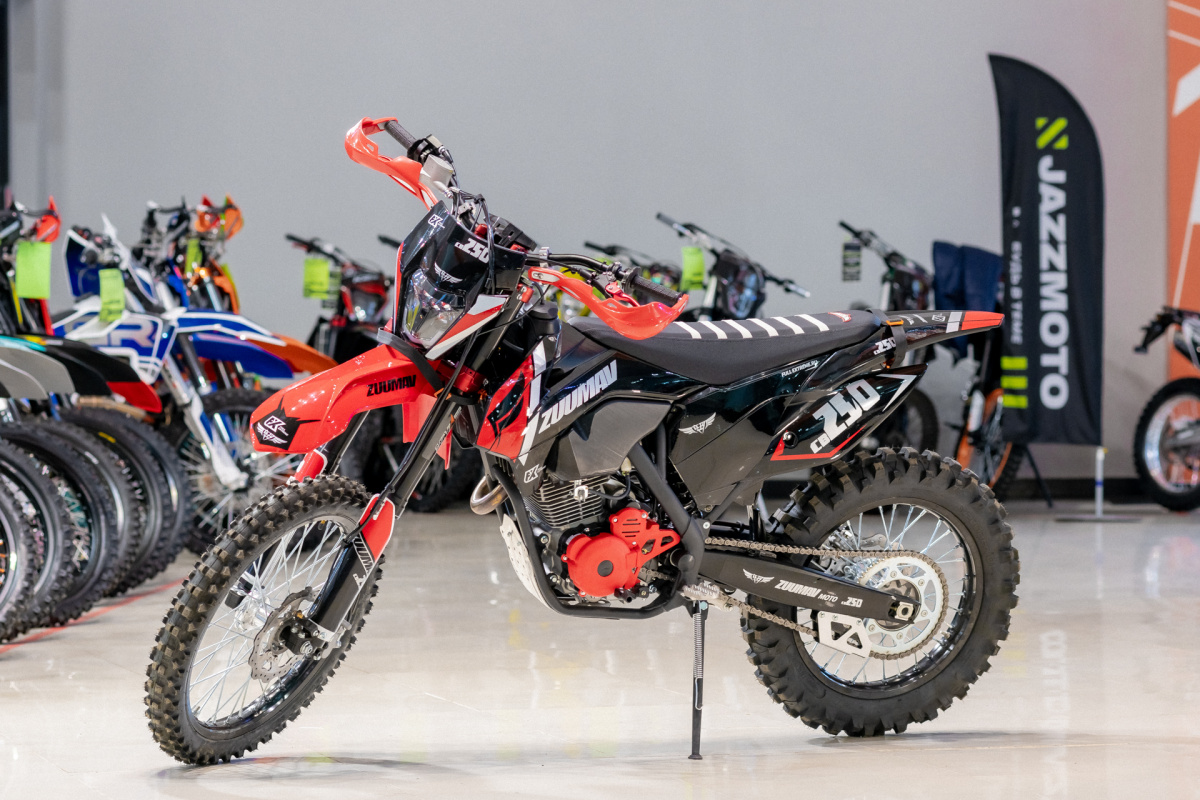 Одна из самых популярных моделей компании Zuumav. В ней сосредоточены все передовые наработки и технологии. Стоит так же обратить внимание и на яркий дизайн, стальная рама хром-молибденовая повышенной прочности, красного цвета. На ней бело красная графика. Двигатель четырехтактный 172FMM 250 куб. мощностью в 21 л.с. с воздушным охлаждением и пяти ступенчатой механической коробкой. Карбюратор установлен NIBBI RACING 30, отличное решение, компания хорошо себя зарекомендовала. В Zuumav CR250 CB чувствуется внимание к деталям: выхлопная система из нержавеющей стали с резонатором, алюминиевый глушитель FMF. Полностью регулируемая подвеска ККЕ. Усиленные диски и ступицы из алюминия с установленными буксаторами AJ1. Большой бак черного цвета 6.7 литров. Удобное противоскользящее и износостойкое сиденье. Стоит диодная фара с хорошим освещением, при использовании в темное время суток у вас не возникнет проблем и ваш маршрут будет хорошо освещен.